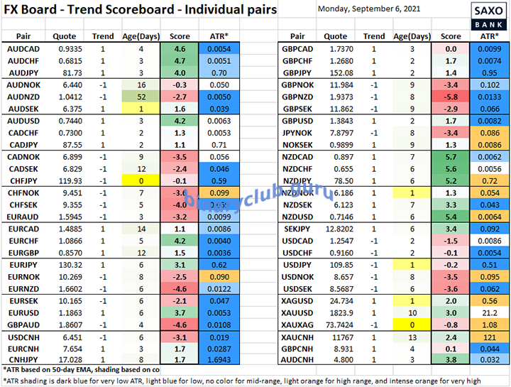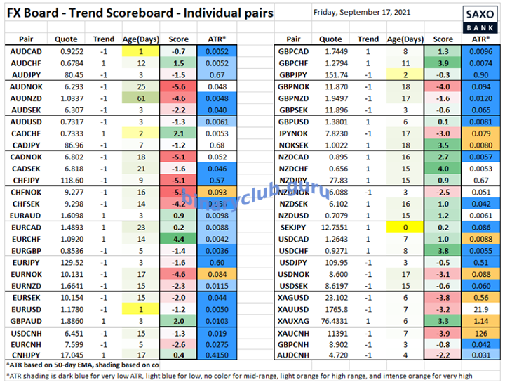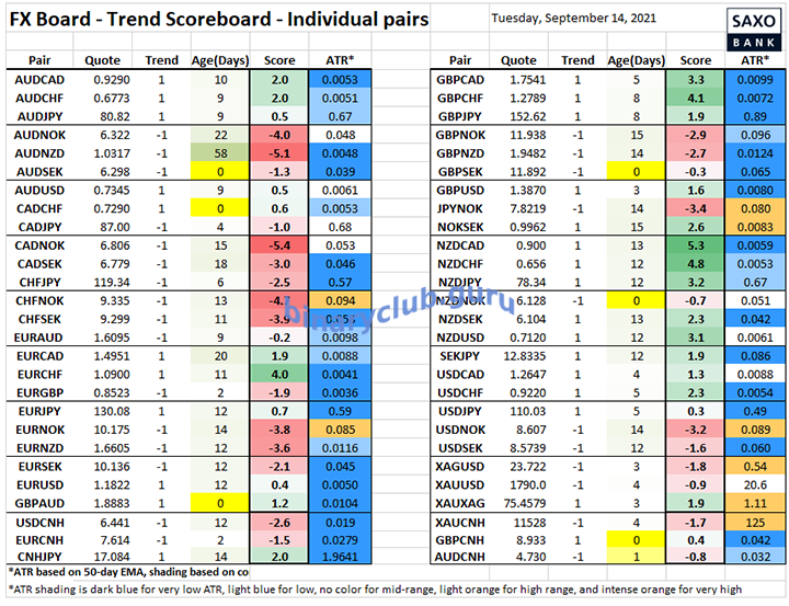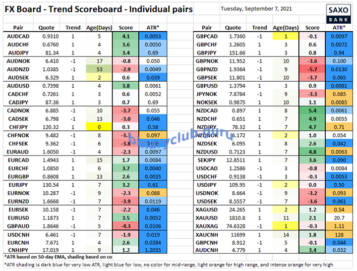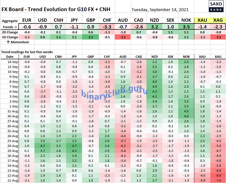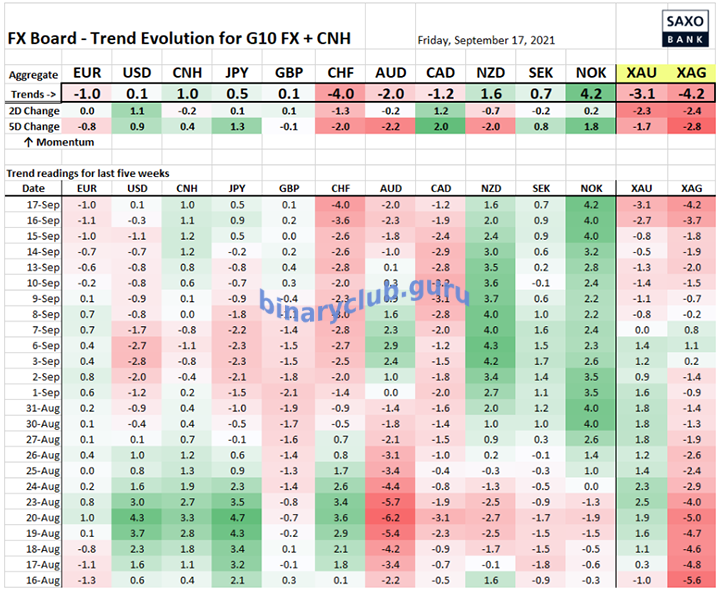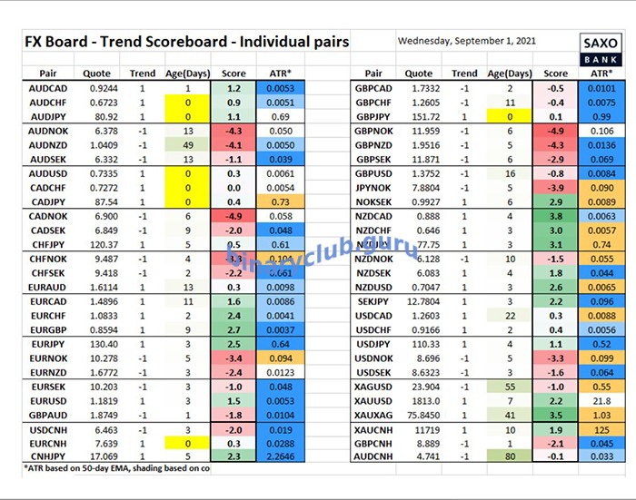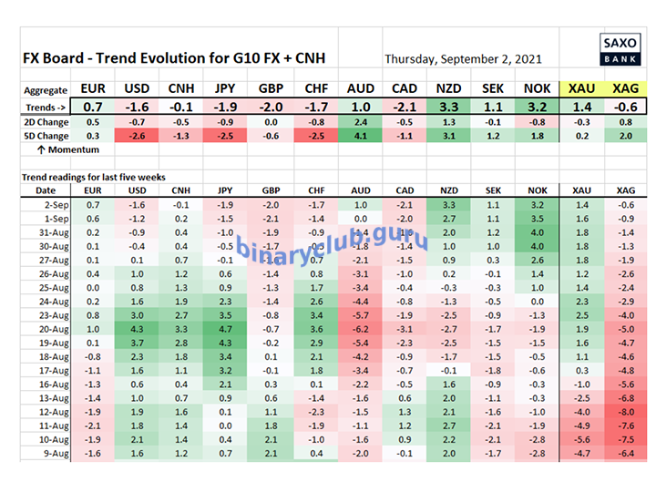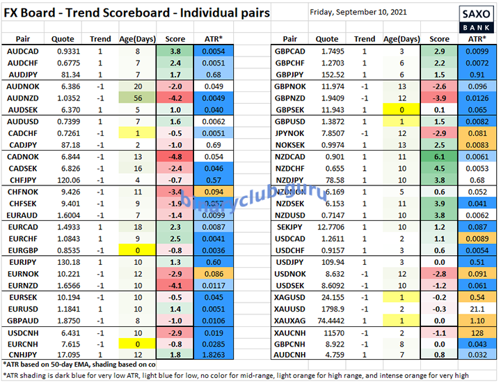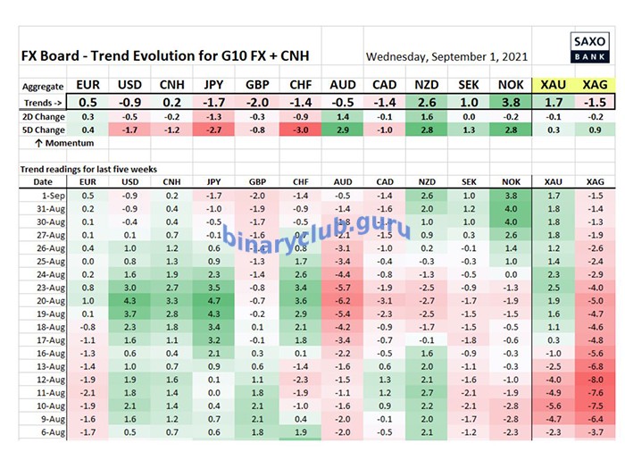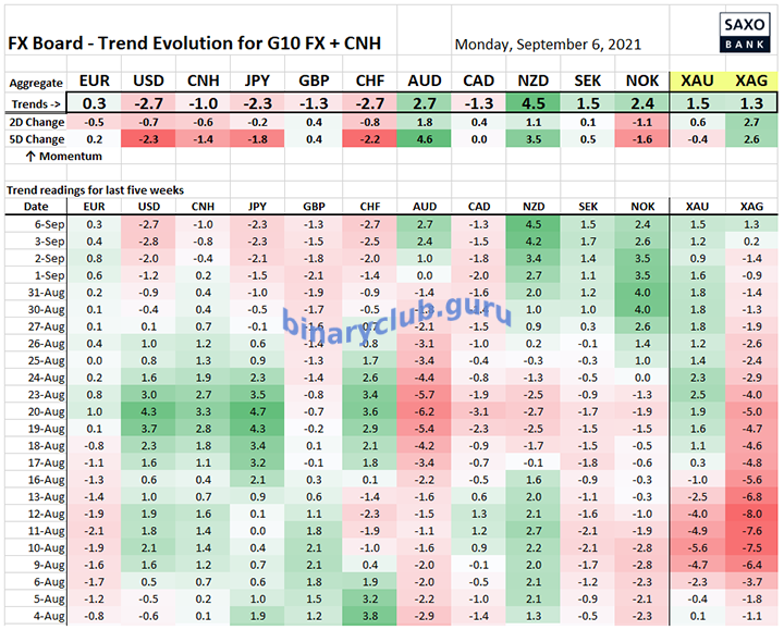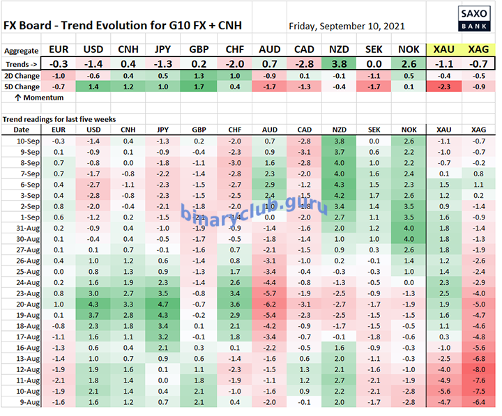 Таблица: Показатели силы и изменения трендов в валютах G10 и юане