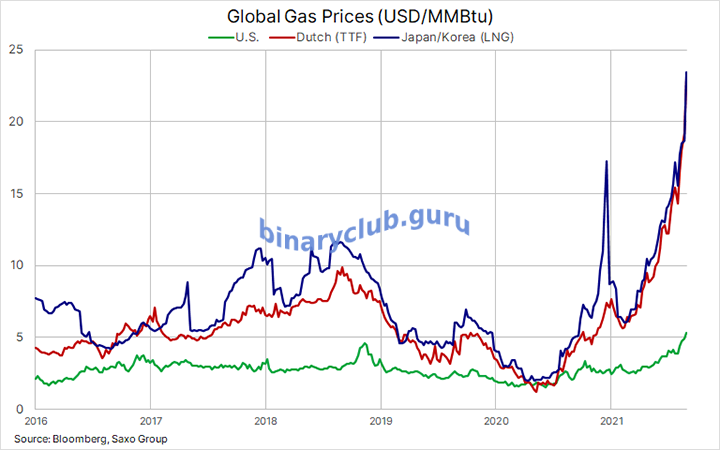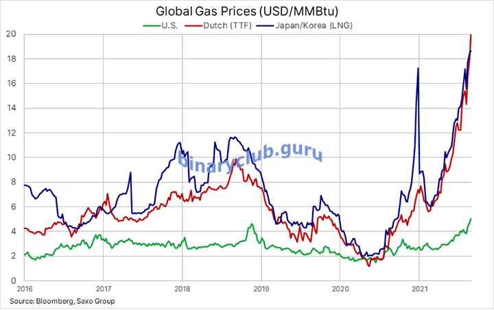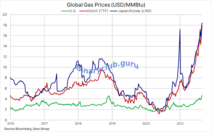 Сектор природного газа, который сильно вырос в последние месяцы, получил дополнительный импульс в результате возможного сбоя в работе экспортных терминалов СПГ на побережье Мексиканского залива. В Европе голландский эталонный показатель TTF достиг рекордных 52,85 евро / МВтч или 18,5 млн БТЕ. Такой же уровень был достигнут и в Азии, где рынки Японии и Кореи приблизились к январскому рекорду в 19 долларов за миллион БТЕ. Нехватка мировых запасов, вызванная сильным экономическим ростом, жаркой погодой и сокращением поставок из России в Европу – все это дало сектору природного газа серьезный импульс. Результатом являются очень высокие счета за электроэнергию, резкий рост цен на уголь, который выступает в качестве альтернативы, а также рост стоимости компенсации за выбросы углерода.