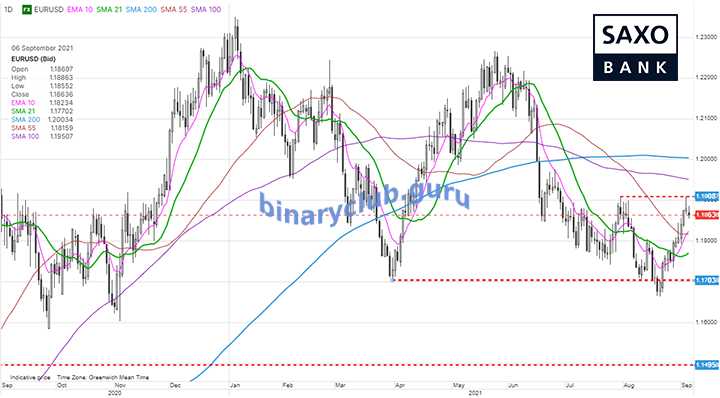 Количество новых рабочих мест вне сельскохозяйственного сектора США за август оказалось меньше ожиданий почти на полмиллиона, хотя данные за предыдущие два месяца пересмотрены вверх на 135 тысяч. Учитывая мощную волну заболеваемости Covid-19 в августе, цифры не так уж и плохи; к тому же, начиная с сентября и до конца года ситуация будет уже другой, ведь с прошедших выходных прекратились выплаты пособий по безработице в связи с пандемией. Интересной стала реакция на эти данные со стороны казначейских облигаций США, доходности которых подскочили вверх и остались повышенными до закрытия. Скорее всего, это связано с публикацией средней почасовой оплаты труда, поднявшейся на 0,6% в месячном исчислении вместо ожидавшихся 0,3%. Немногие, правда, обратили внимание, что в значительной степени ускоренный рост вызван случайным падением среднего количества рабочих часов на 0,1 в неделю. Что ж, иногда рынок видит то, что хочет видеть, и нам приходится принимать его движения как есть. Доходности европейских облигаций тоже пошли вверх, как указано ниже при графике EURUSD. По-прежнему высокому значению индекса ISM в сфере услуг (61,7 за август, на уровне ожиданий) в новостях уделяется мало внимания.