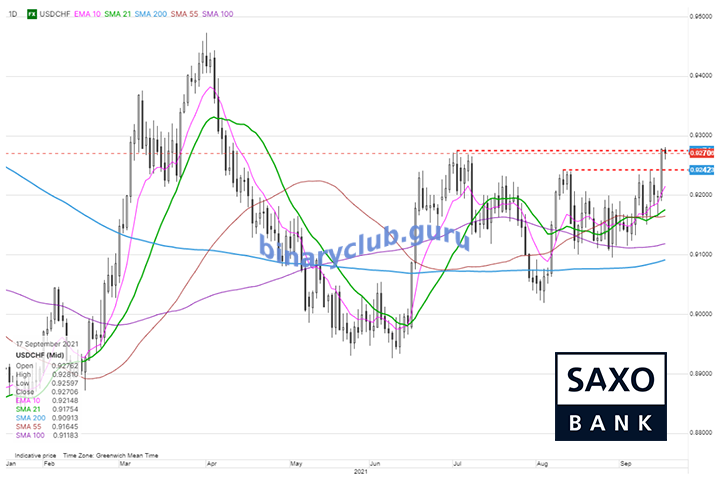 Доллар США вчера поднялся вслед за доходностями американских облигаций после отчёта о розничных продажах, результаты которого оказались значительно выше ожиданий – особенно за вычетом автомобилей и бензина: +2,0% в месячном исчислении вместо 0% (хотя этому помог пересмотр июльских данных на 0,7% вниз). USD подскочил в особенности к самым низкодоходным валютам – CHF и JPY, но пара EURUSD тоже упала на консолидационный минимум. Такая чувствительность к единственной публикации, может быть, показывает, что рынок больше думал о заседании FOMC на следующей неделе (см. ниже). Сегодня мы также увидим предварительный индекс настроений Мичиганского университета за сентябрь; напомню, что августовское его значение оказалось хуже, чем даже в месяцы начала пандемии в прошлом году. Рекомендую ещё прослушать сегодняшний подкаст Saxo Market Call.