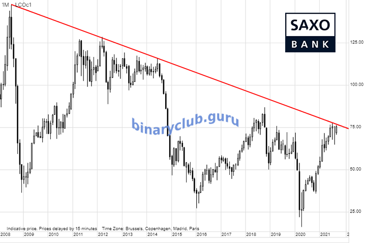 Однако опасения по поводу спроса в Китае, продолжающегося восстановления добычи в США и перспективы увеличения объемов добычи сырой нефти из стратегических запасов Китая и США могут ограничить дальнейший краткосрочный рост выше многолетней линии тренда, восходящей к рекордному пику 2008 года; в настоящее время нефть торгуется чуть ниже 77 долларов.