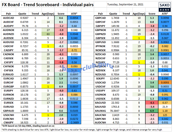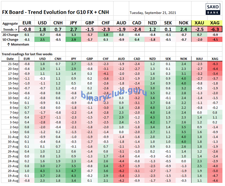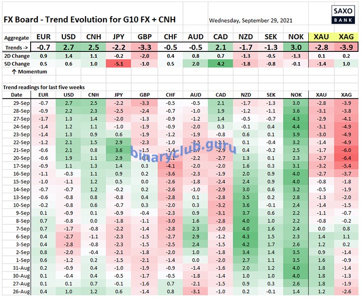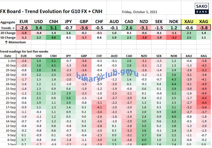 Как я писал в «Saxo Q4 Outlook», который выйдет в начале следующей недели, но был подготовлен более недели назад, четвертый квартал может оказаться сложным испытанием для долларовых «медведей». И это уже подтверждается еще до начала четвертого квартала, поскольку ключевые уровни сопротивления доллару США вчера были сметены: пара EURUSD упала ниже 1,1665 и даже ниже минимума конца 2020 года (1,1603), в то время как другие валюты также падали ниц перед растущим долларом. Как отмечается в выдержке, наиболее интересным аспектом вчерашнего движения было то, что оно разворачивалось в отрыве от других факторов, таких как настроения риска (в основном стабильные; даже если вчера немного снизились, то сегодня фактически восстановились) и доходность казначейских облигаций США (консолидируется). Одним из факторов, помимо того, что критическое сопротивление ослабло (что, вероятно, обусловило как стоп-ауты, так и новое позиционирование), является конец месяца и квартала, поэтому нам еще предстоит увидеть, как это движение закрепится в ближайшие дни. Пока же мы должны принять его за чистую монету и спросить, что является его движущей силой и как далеко оно может зайти.