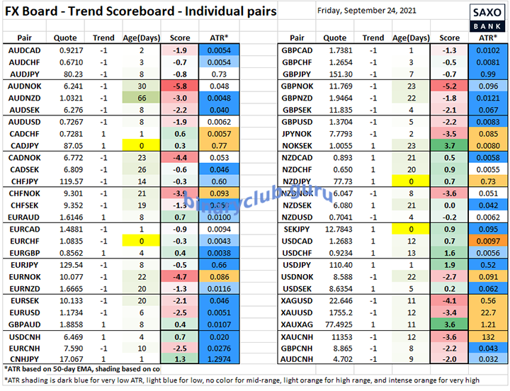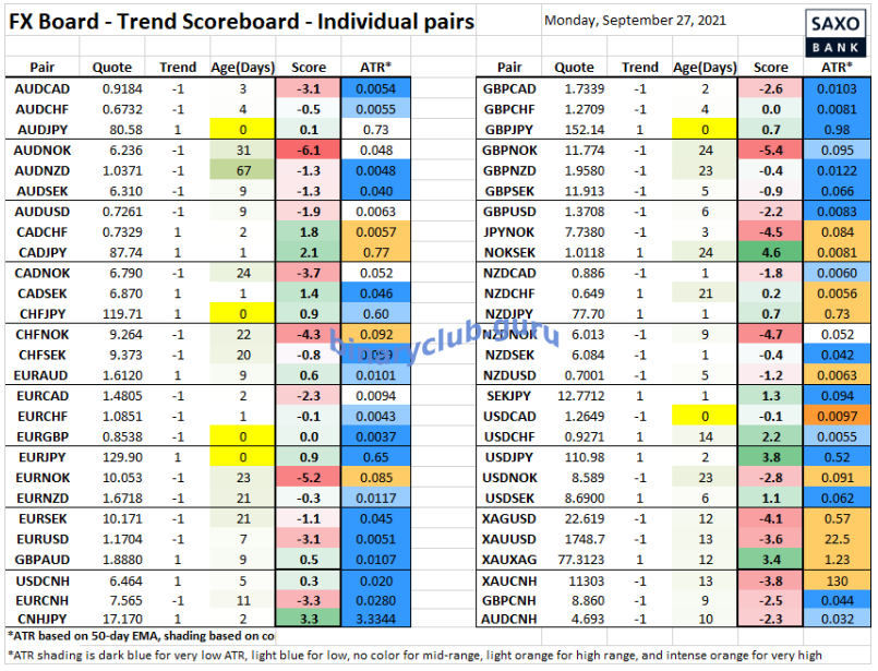 Интересно отметить непостоянную волатильность: многие пары торгуются с небольшими внутридневными диапазонами (колонка ATR заштрихована темно-синим цветом), в то время как другие находятся на повышенных уровнях (заштрихованы оранжевым цветом – очень высокие уровни имеют темно-оранжевый цвет, и только USDCAD сегодня находится в этой категории).