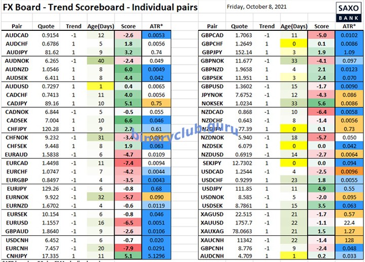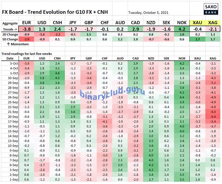 Таблица: Показатели силы и изменения трендов в валютах G10 и юане