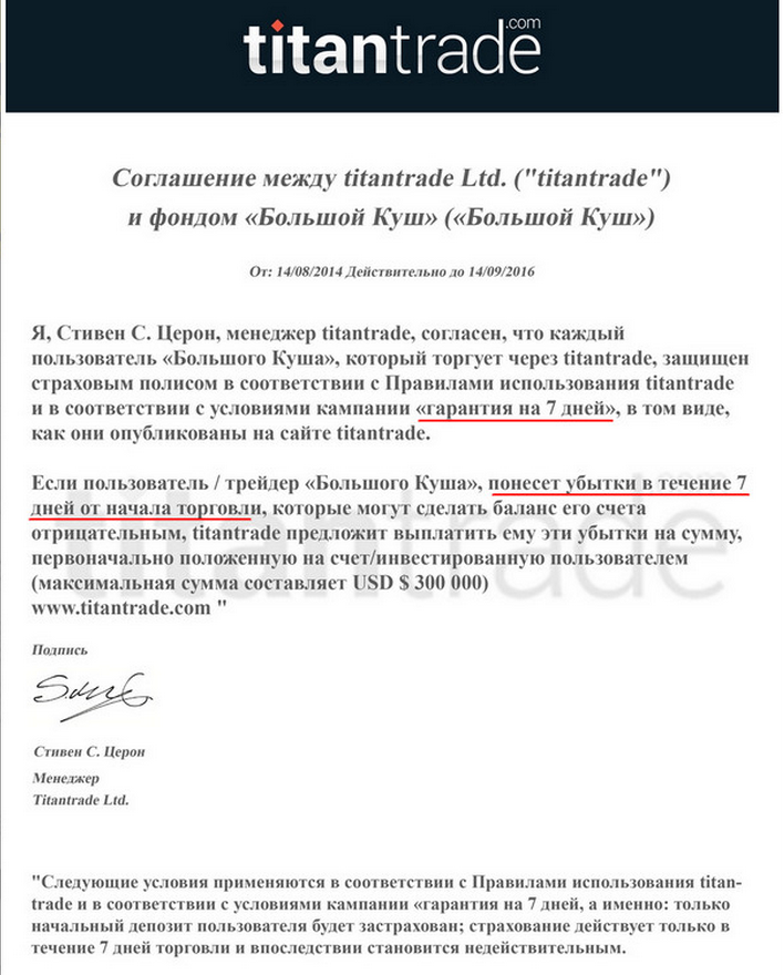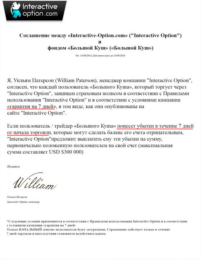 В гарантированных соглашениях видно, что гарантия всего семь дней, а значит можно считать что её вообще нет. В течении семидневного периода все будет хорошо, вам возвращать деньги а дальше? Ну а дальше как обычно - "Бинарные опционы связанны с высоким риском"! Итак у нас очередной момент недоверия к этому проекту, тут явно ввод в заблуждение. При этом обратите внимание, что гарантию даёт не сам Владимир Воскресенский, и не проект "Большой куш", а менеджеры брокерских компаний, которые завтра уже не будут работать, а соответственно и гарантию предоставить некому будет.