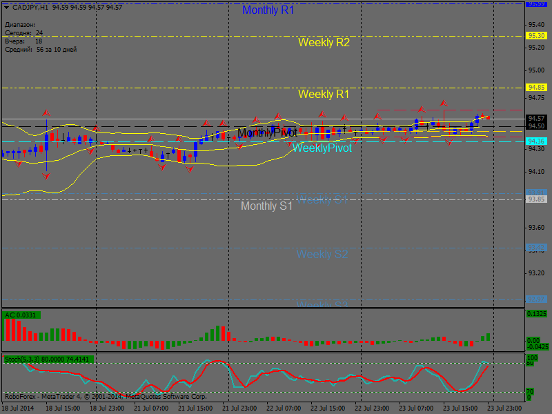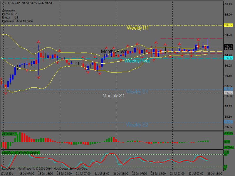 На момент написания аналитического обзора рассматриваемый торговый инструмент CAD/JPY достиг уровня и расположен на важной ценовой отметке. Текущая рыночная ситуация возникает при смене тренда, глубокой коррекции. Расстояние до разворотного арбитражного уровня - 7пп. 94.40 следует рассматривать как вектор дальнейшего движения пары. Этот уровень и будет задавать вектор возможного импульсного движения пары в дальнейшем, но только при выходе из имеющегося диапазона.