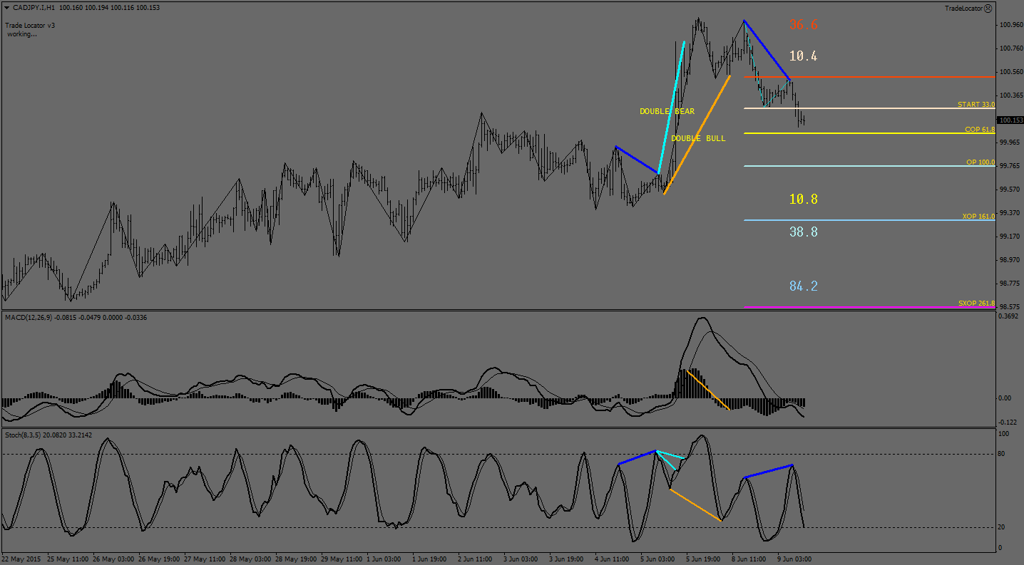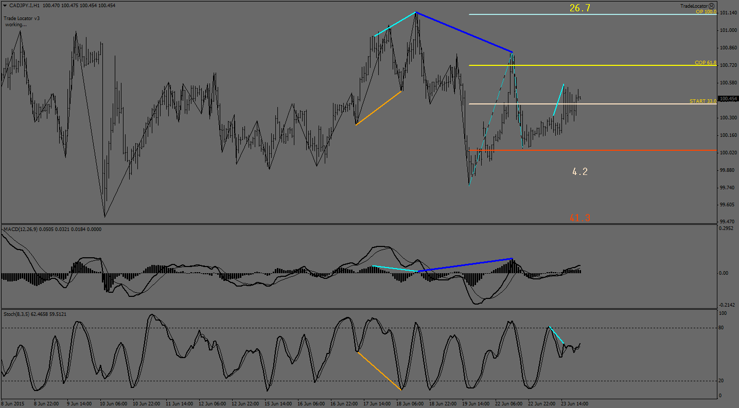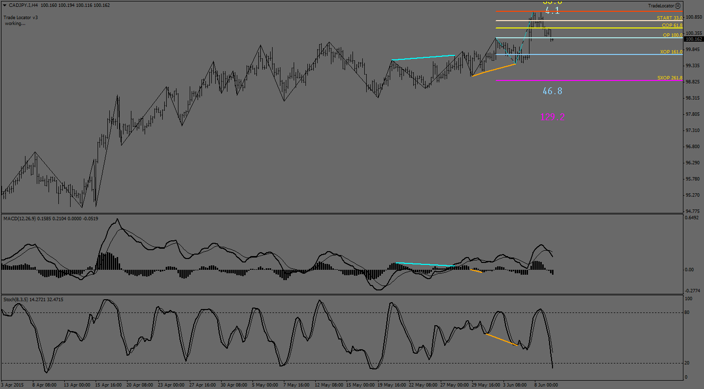 По валютной паре канадец иена на часовом графике получен сигнал к продажам и с учетом формирования медвежьей дивергенции на 4-х часовом графике можно входить на продажу с целями для снижения на уровне расширенной целевой точке ДиНаполи = 161.8% и далее уже по факту пробоя указанного уровня к супер расширенной целевой точке ДиНаполи = 261.8% где можно зафиксировать прибыль по продажам. Анализ 4-х часового графика подтвердает возможность среднесрочного падения курса по паре канадец иена.