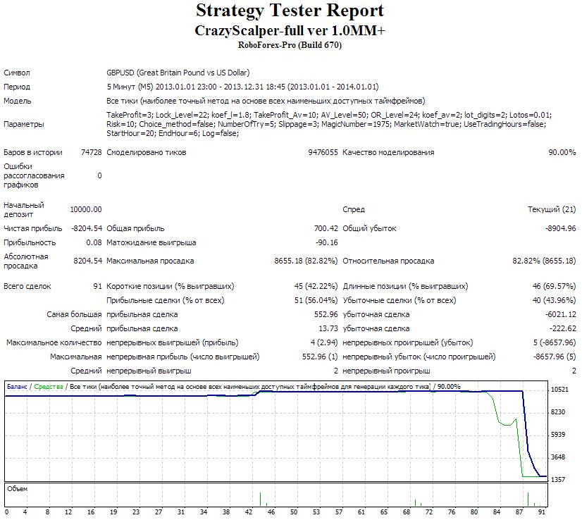 bestinvest писал(а):Да-да, именно красочно. Меня сразу тоже заинтересовал этот советник, правда, версию 1.1 не нашёл ( кстати автору темы просьба выложить сам советник), но тем не менее "прогуглился" и нашёл версию 1.0. Ну и естественно сразу же решил попробовать её на тестере, причём по умолчанию был выставлен лот 0.1, и в начале результат меня потряс, когда он удвоил депо за пару недель, но потом...слил :( . Я подумал, что это скорее всего из-за десятикратного завышения риска, и тут же выставил начальный лот 0.01 и вот что получилось :( :