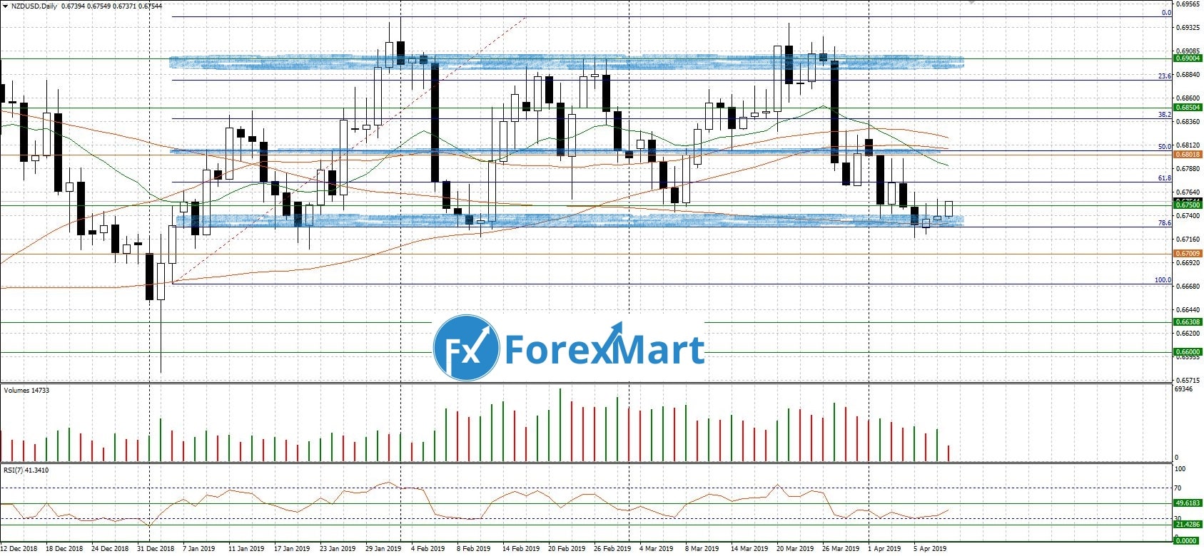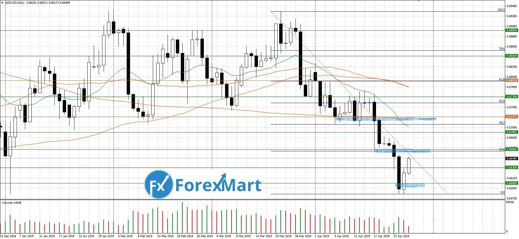 Цена торгового инструмента NZD/USD корректируется от минимумов по направлению к ближайшему уровню поддержки на пробитом ранее уровне 0.6666, расположенном в области 23.6 Фибоначчи.