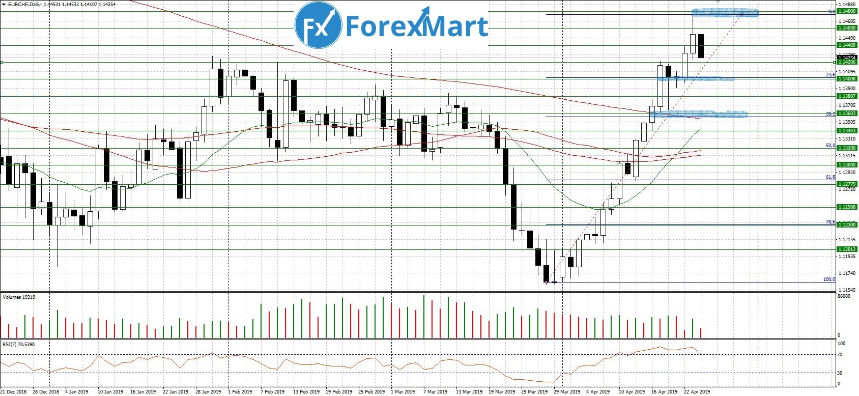 Валютная пара евро/швейцарский франк в ходе вчерашних торгов вплотную приблизилась к цели для роста на уровне сопротивления 1.1480, обновив ценой максимум за последние полгода.