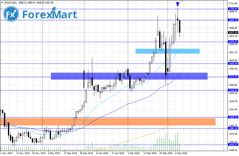 Цена XAU/USD обновила максимум с декабря 2012 года, достигнув среднесрочной цели для роста на уровне 1700. Сегодня пара корректируется по направлению к пробитому ранее уровню 1640.