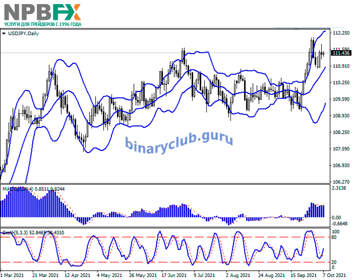 Полосы Боллинджера на дневном графике демонстрирует уверенный рост. Ценовой диапазон незначительно сужается, однако остаётся достаточно просторным для нынешнего уровня активности на рынке. Индикатор MACD разворачивается в сторону снижения, формируя новый сигнал на продажу, располагаясь ниже сигнальной линии. Стохастик, достигнув в очередной раз отметки «80», развернулся в горизонтальную плоскость, сигнализируя о сильной перекупленности инструмента в сверхкраткосрочной перспективе.