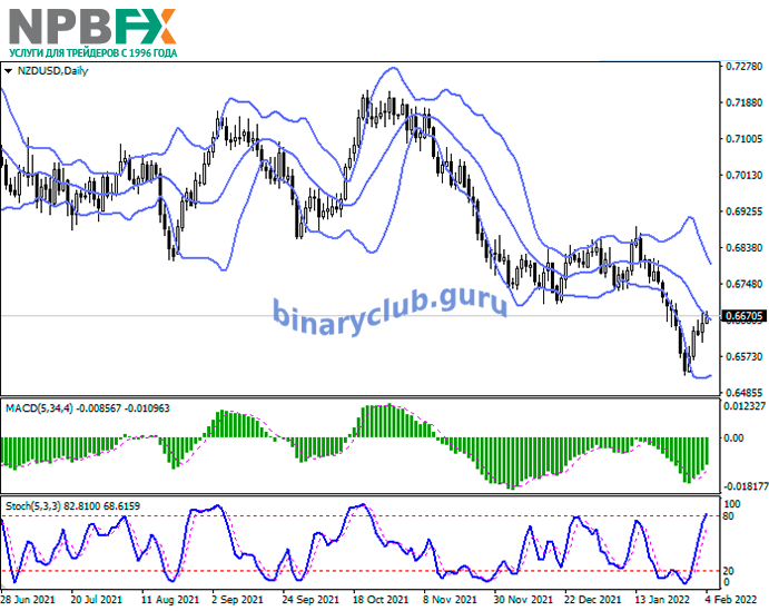 На дневном графике полосы Боллинджера уверенно снижаются. Ценовой диапазон сужается снизу, отражая появление флэтовой динамики торгов в краткосрочной перспективе. Индикатор MACD растёт, сохраняя прочный сигнал на покупку (гистограмма располагается выше сигнальной линии). Стохастик демонстрирует похожую динамику, приближаясь к своим максимальным значениям, что указывает на риски перекупленности новозеландского доллара в сверхкраткосрочной перспективе.