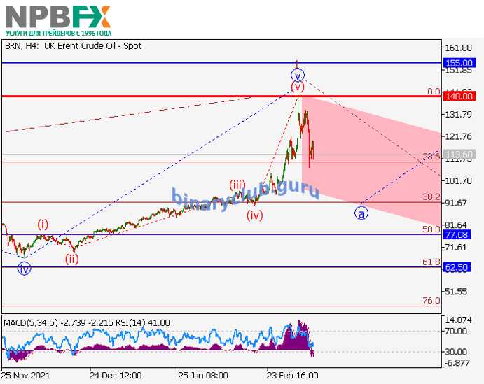 На дневном графике идёт развитие восходящей волны C, в составе которой сформировалась первая волна 1 of (1) of C. В настоящий момент началось развитие нисходящей коррекции в качестве второй волны 2 of (1) of C, в составе которой развивается волна a of 2. Если предположение верно, то цена снизится к отметкам 77.08–62.50. Критическим уровнем стоп-лосса для данного сценария является отметка 140.00.