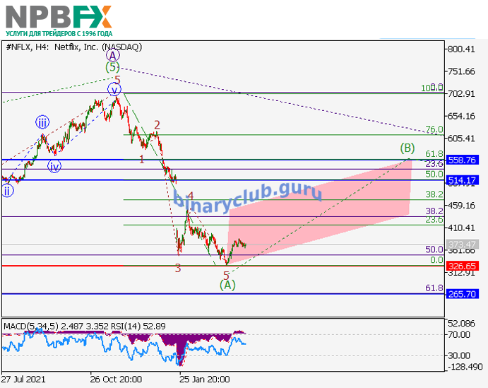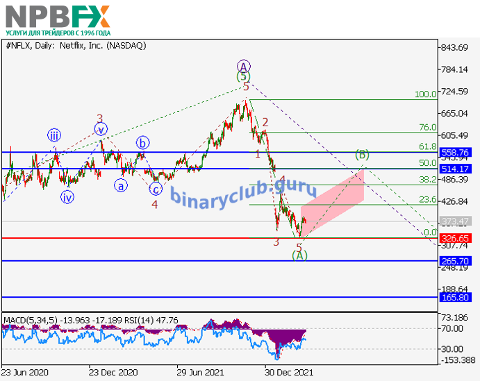 На дневном графике сформирована волна А старшего уровня, и началось развитие нисходящей коррекции в качестве волны B. В настоящий момент завершилось формирование волны младшего уровня (А) of B, и началось развитие восходящей коррекции ( B ) of B. Если предположение верно, то цена вырастет к отметкам 514.17–558.76. Критическим уровнем стоп-лосса для данного сценария является отметка 326.65.
