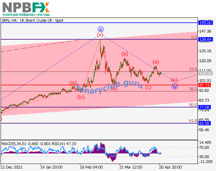 На дневном графике идёт развитие восходящей волны C, в составе которой продолжает формироваться первая волна 1 of (1) of C. В настоящий момент завершилось развитие третьей волны младшего уровня iii of 1, и близится к завершению формирование локальной коррекции в качестве четвёртой волны iv of 1, в составе которой развивается волна (e) of iv. Если предположение верно, то после завершения коррекции цена вырастет к отметкам 139.64–155.00. Критическим уровнем стоп-лосса для данного сценария является отметка 97.73.
