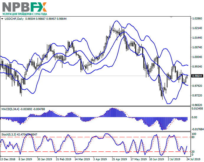 Доллар США вырос против швейцарского франка 23 июля, показав развитие «бычьего» импульса, сформированного в конце прошлой недели. Давление на франк оказывают негативные перспективы Brexit, а также заявления президента США Дональда Трампа, который отметил, что «в торговых вопросах Евросоюз хуже Китая». Инвесторы опасаются обострения торгового конфликта США и ЕС, поскольку Трамп уже не в первый раз пытается навязать повышение пошлин на европейские товары. Опубликованная макроэкономическая статистика оказалась противоречивой. Продажи на вторичном рынке жилья США в июне упали на 1,7% после роста на 2,9% м/м в прошлом месяце. Аналитики рассчитывали на снижение лишь на 0,2% м/м. Индекс деловой активности в производственном секторе ФРБ Ричмонда в июле резко снизился с 3 до −12 пунктов при прогнозе о росте до 5 пунктов. Европейская статистика отразила незначительный рост уровня доверия потребителей с −7,2 до −6,6 пункта при неизменном прогнозе.