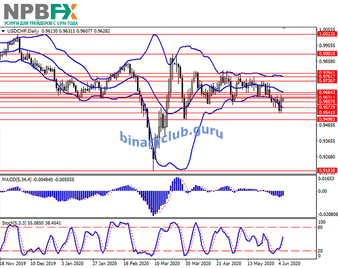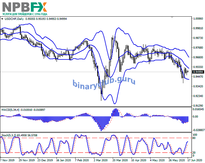 На 4-часовом графике полосы Боллинджера зафиксировались в широком диапазоне, который допускает сохранение высокой активности торгов в краткосрочной перспективе. Индикатор MACD растёт, начиная формировать бары выше нуля и давая сигнал к покупке. Стохастик снижался после достижения уровня 80%, но собирается снова развернуться вверх, сигнализируя в пользу развития восходящего тренда в сверхкраткосрочной перспективе. В данный момент локальными уровнями поддержки и сопротивления выступают 0.9541 и 0.9651.