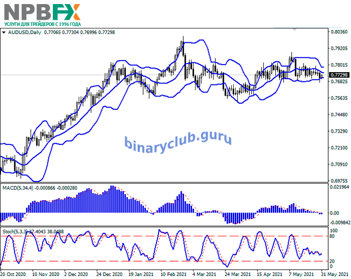 Полосы Боллинджера на дневном графике демонстрируют флэтовую динамику. Ценовой диапазон практически не изменяется, однако остаётся достаточно просторным для нынешнего уровня активности на рынке. Индикатор MACD растёт, сохраняя слабый сигнал на покупку (гистограмма располагается выше сигнальной линии). Кроме того, в настоящий момент индикатор пытается закрепиться выше нулевой отметки. Стохастик также сохраняет восходящую направленность, но располагается вблизи своих максимальных значений, указывая на риски перекупленности австралийского доллара в сверхкраткосрочной перспективе.