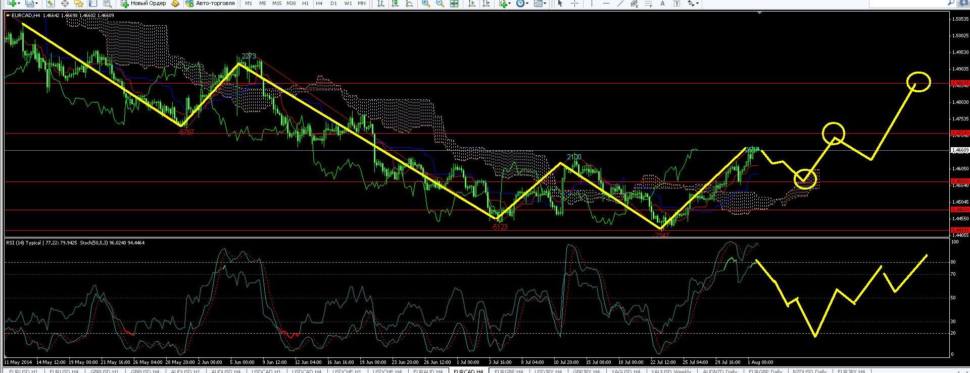 По паре EURCAD на 4 часовом графике на этой недели жду снижения небольшое по паре, коррекция, после чего считаю что от уровня 1,4560 не ниже начнется новая волна укрепления где первая цель будет на уровне 1,4720 далее откат и рост к уровню 1,4860,где и можно будет наращивать продажи, пока же только покупки на снижение.