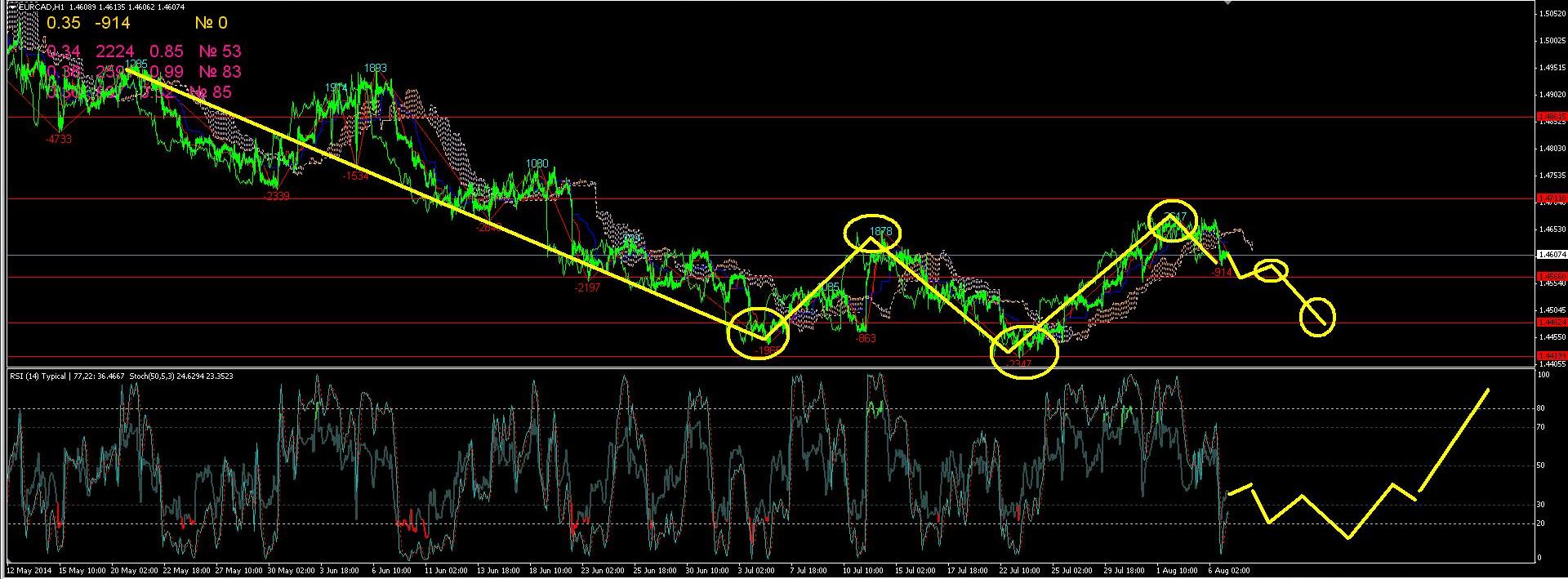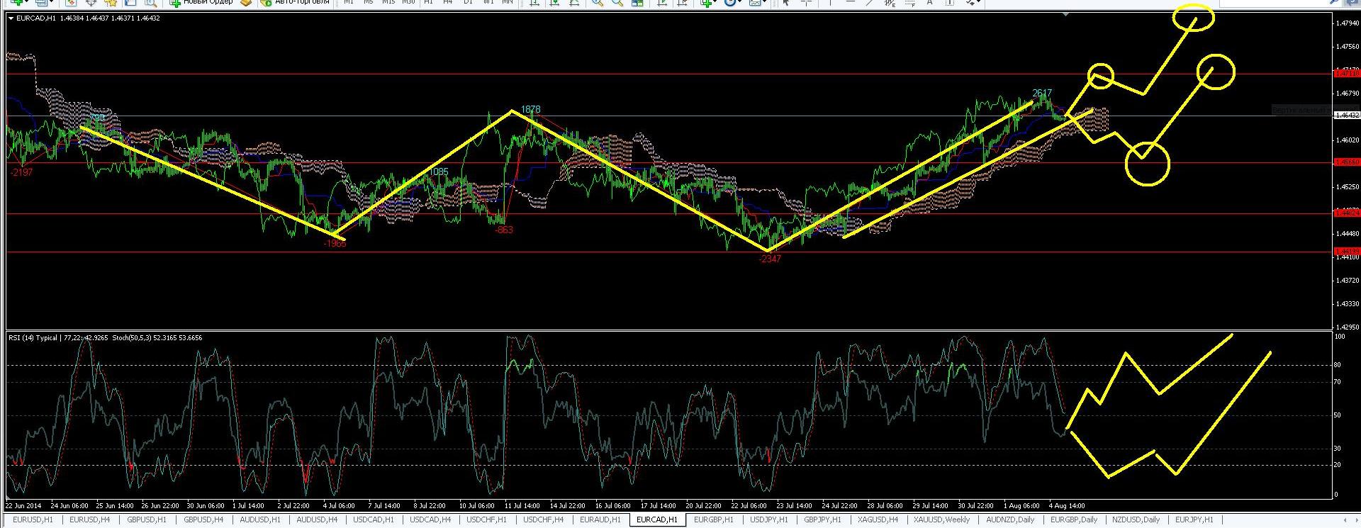 По паре EURCAD на часовом графике после снижения к нижней линии восходящего канал пара уже отскочила и теперь или продолжения роста что считаю основным вариантом к уровню 1,4710 далее откат и п ара дальше пойдет вверх,или же пара пробьет вниз канал и упадет к уровню 1,4560 откуда так же жду укрепления вверх к уровню 1,4710.