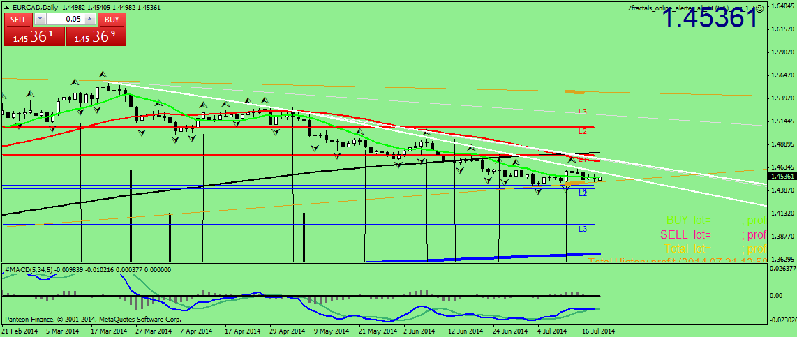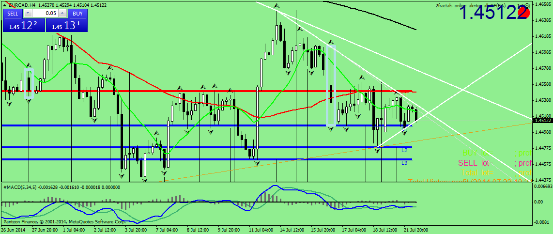 В данный момент пара EUR/CAD продолжает торговаться зажатой между двумя трендовыми на тайме Н4, поэтому пока не рассматриваю сделки по паре до более ясной ситуации, то-есть ждать теста линий тренда, в случае закрепления под восходящей - 1,4512 - входить в продажи, если же закрепится над нисходящей - 1,4532 буду рассматривать покупки.