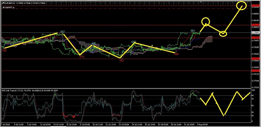 По паре EURGBP на часовом графике пара на этой недели ожидаю продолжения укрепления пары к уровню 0,8020 где и будет первая цель, далее вероятно будет коррекция вниз небольшая до уровня 0,7980 после чего жду укрепления к главной цели на уровне 0,8090 откуда буду наращивать продажи, так как считаю укрепления все в виде коррекции глубокой вверх.