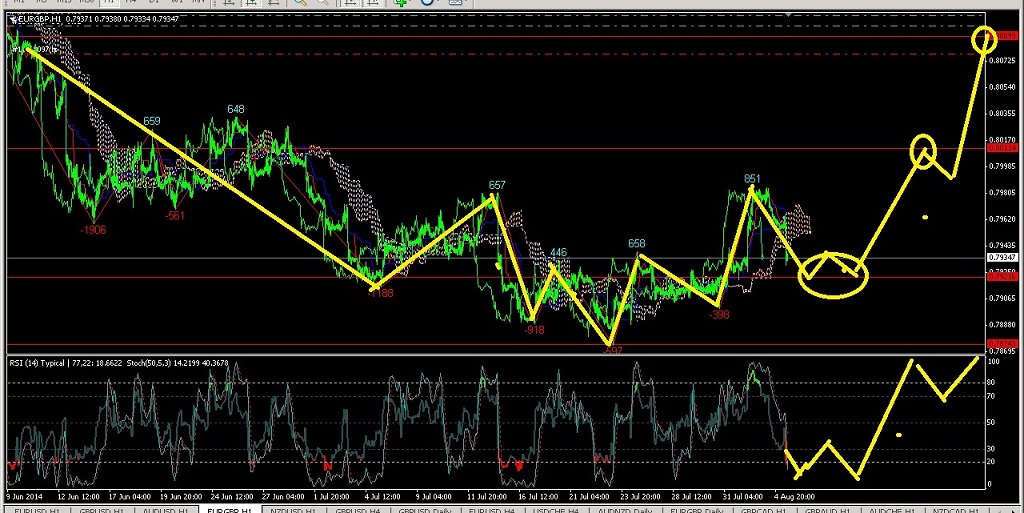 По паре EURGBP на 4 часовом графике на этой недели ожидаю в начале недели небольшую коррекцию вниз к уровню 0,7940 максимум откуда можно будет купить пару, так как считаю будет новая волна укрепления, где цель будет первая на уровне 0,8020 далее последует коррекция и рост к главной цели на уровне 0,8080.