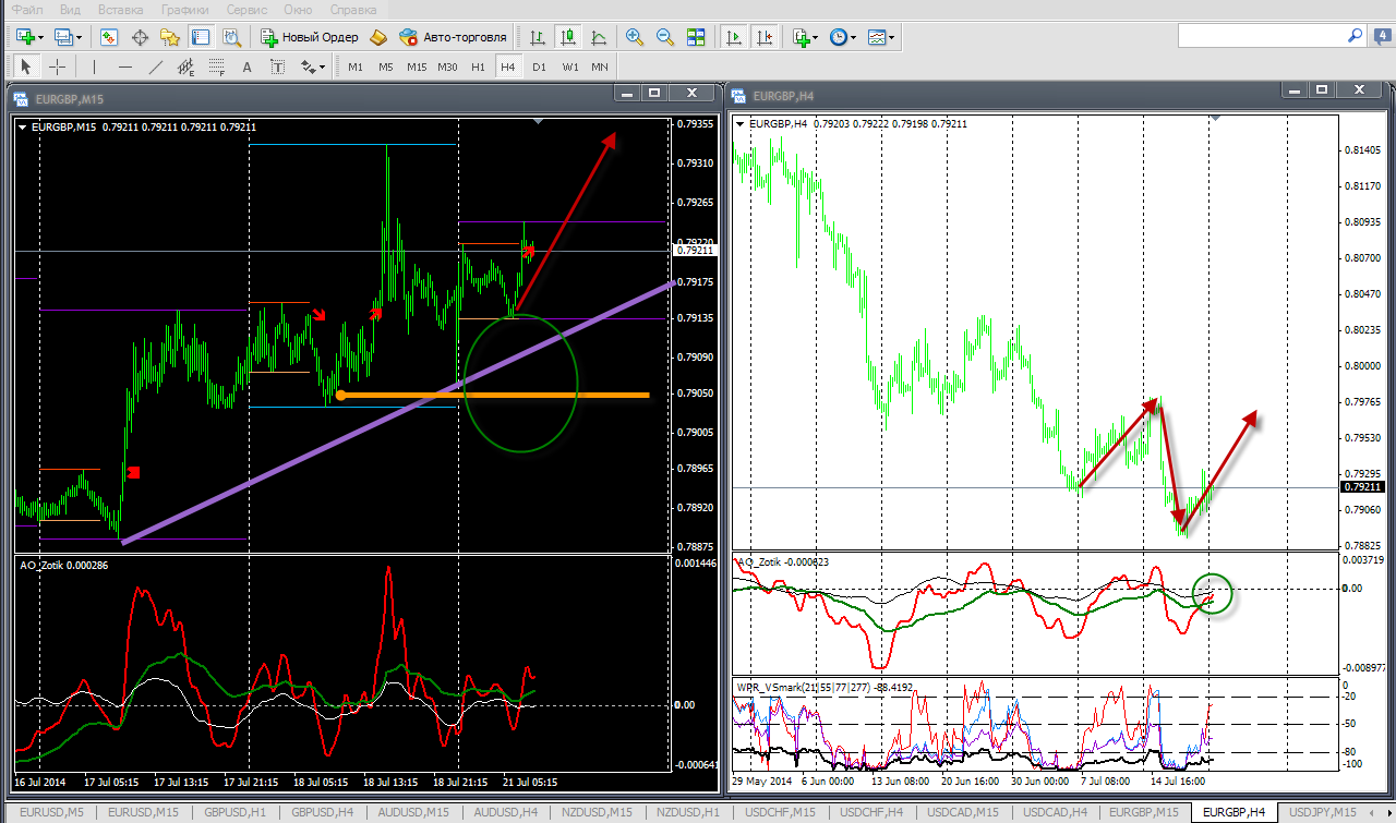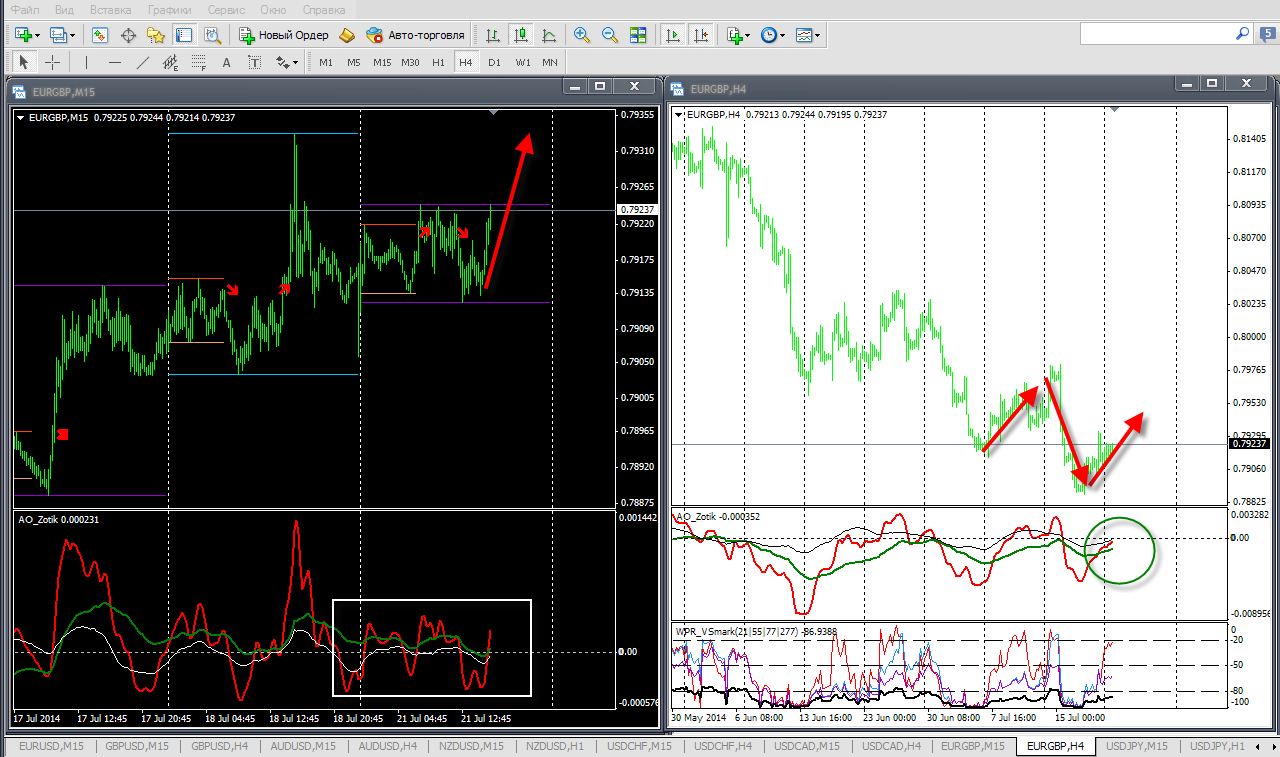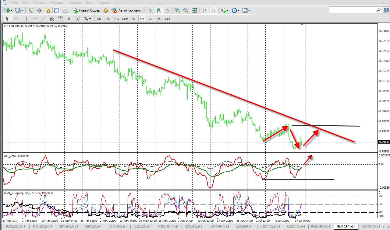 По кроссу евро/фунт цена предпринимает попытки выйти за пределы верхней границы МСФ, но пока без результатов. На М15 имеем третье касание уровня 0,7924, пробой которого вполне вероятно как и рассчитываю, достанет цель 0,7933. АО указывает на сложную коррекцию, остановка у защитного пивота 0,7925. Не хватает драйвера для импульса.