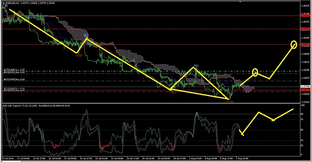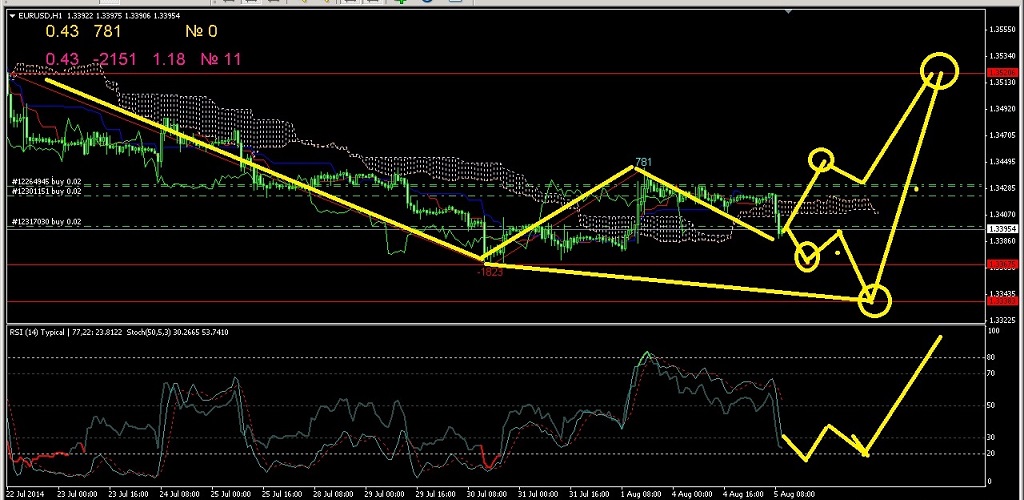 По паре EURUSD на часовом графике на данный момент небольшая коррекция вниз и тут остановка на уровне 1,3420-1,3380 ожидается. После чего считаю что вероятно рост начнётся сильный где первый уровень будет на 1,3520 далее последует коррекция и рост к уровню 1,3620 где жду главный уровень недельный, поэтому на коррекции вниз буду наращивать еще покупки.