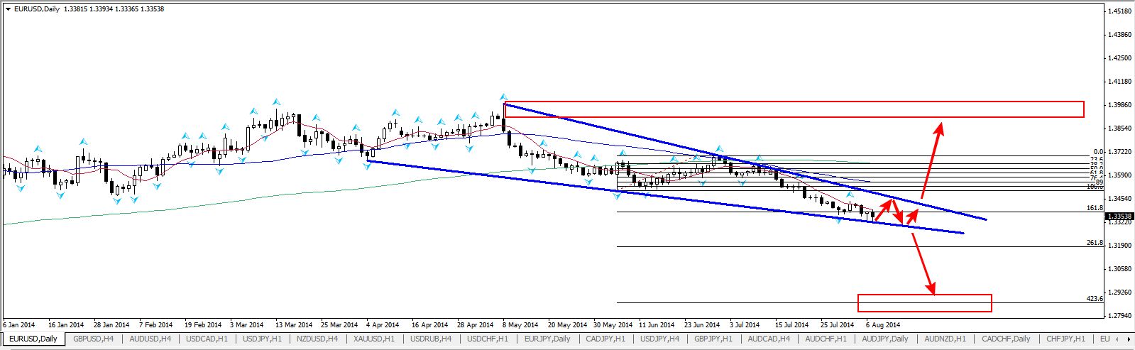 По паре EUR/USD на дневном тайм-фрейме цена демонстрирует сужающийся треугольник это говорит о новой развивающейся тенденции рынка, либо будет рост пары, либо ожидается падение но данную тенденцию мы сможем увидеть когда глобальная линия поддержки отмека 1.32600 будет пробита и закреплена на снижение только тогда можем рассматривать следующие цели на снижение 1.29000 (428% по фибоначи) и ниже если все таки произойдет пробой верхней линии сопротивление тогда пара пойдет к глобальным целям 1.37800-1.38000 и выше но только в том случае когда линию сопротивления цена пробьет и закрепится на отметке хотя бы 1.35700.