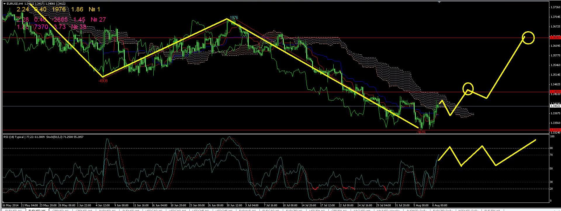 По паре EURUSD на 4 часовом графике на этой недели жду продолжения коррекции вверх, в начале недели вероятно еще будет небольшое снижения до уровня 1,3380 после чего считаю будет рост где первая цель будет на уровне 1,3480 далее откат и рост к главной цели на уровне 1,3630, рост зависит от структуры которую выберет коррекция вверх