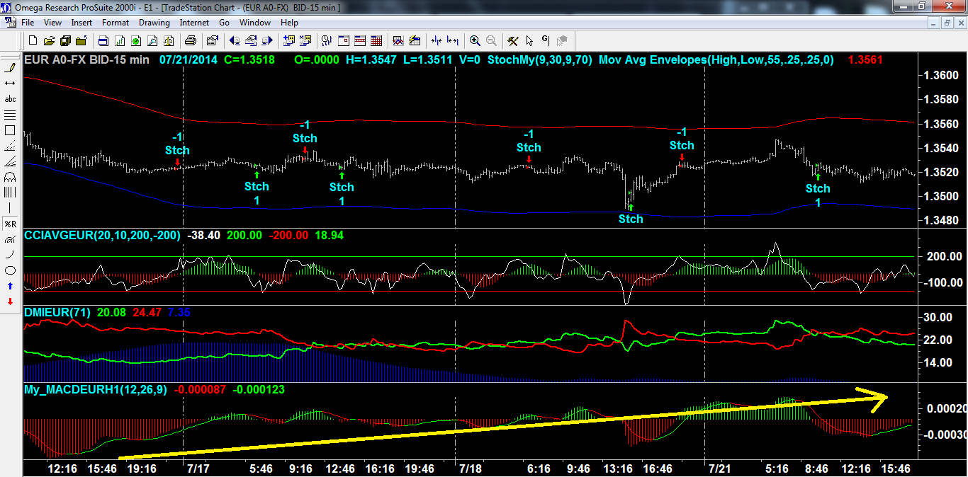 Валютная пара евро доллар сегодня весь день торгуется в нисходящем диапазоне 36 пунктов. Индикаторы макди, стохастик и ас сигнализируют в данный момент на снижение. Считаю что цена будет снижаться до месячного уровня поддержки 1,3436 и после можно будет рассматривать варианты открытия ордера на покупку.