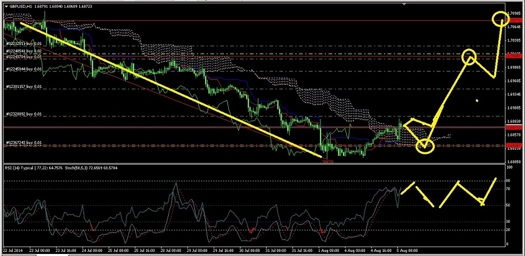 По паре GBPUSD на часовом графике пока все по плану пара постепенно начала укрепляется, или с текущих или же еще немного спустимся к уровню 1,6830 откуда считаю будет рост к уровню 1,7010 после чего считаю будет коррекция и продолжения укрепления вверх к уровню 1,7080, пока считаю что пара вероятно еще раз обновит максимум. После чего и можно будет продавать.