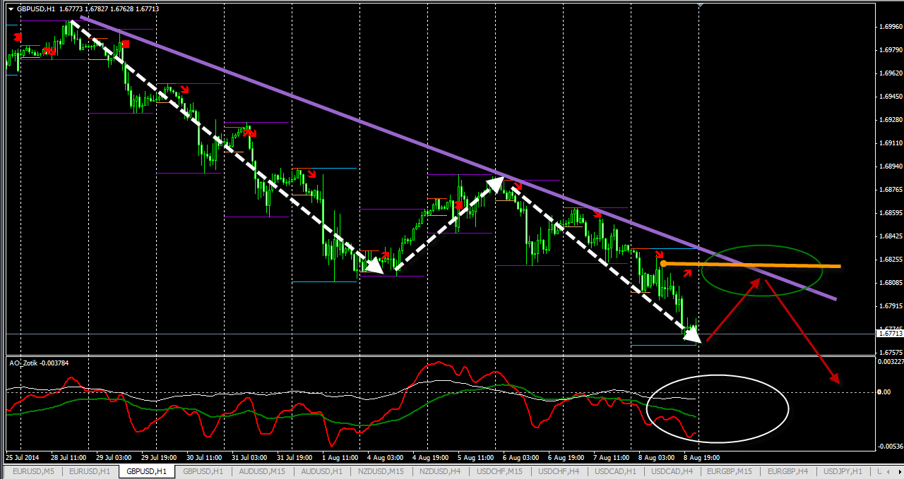 Полностью не согласна с вами. Сейчас цена уперлась в сильный горизонтальный уровень 1.6770, который ранее выступал и как сопротивление и как поддержка, поэтому я полагаю что цена скорее отскочет от него нежели пробъет. Этот уровень видно даже у вас на скрине. И фунт уже достаточно давно падает - нужна коррекция, причем в паре с евро доллар начал терять свои позиции, думаю аналогично будет и с фунтом.