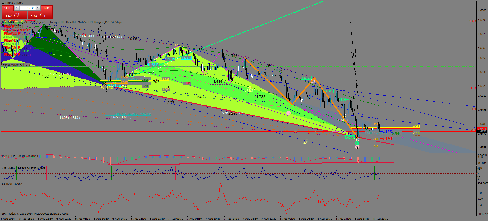 По паре GBPUSD на графике М15 за пятничный торговый день продолжилось падение фунта в последней пятой волне вниз от сопротивления на уровне 1.6829 от 4 до 5 по розовой разметке индикатора волн до поддержки на уровне 1.6766 . Далее ожидаю коррекционную волну вверх или ее же первую волну вверх. Индикатор стохфлет последний сигнал дал на покупки. На индикаторе МАСДи так же присутствует конвергенция.