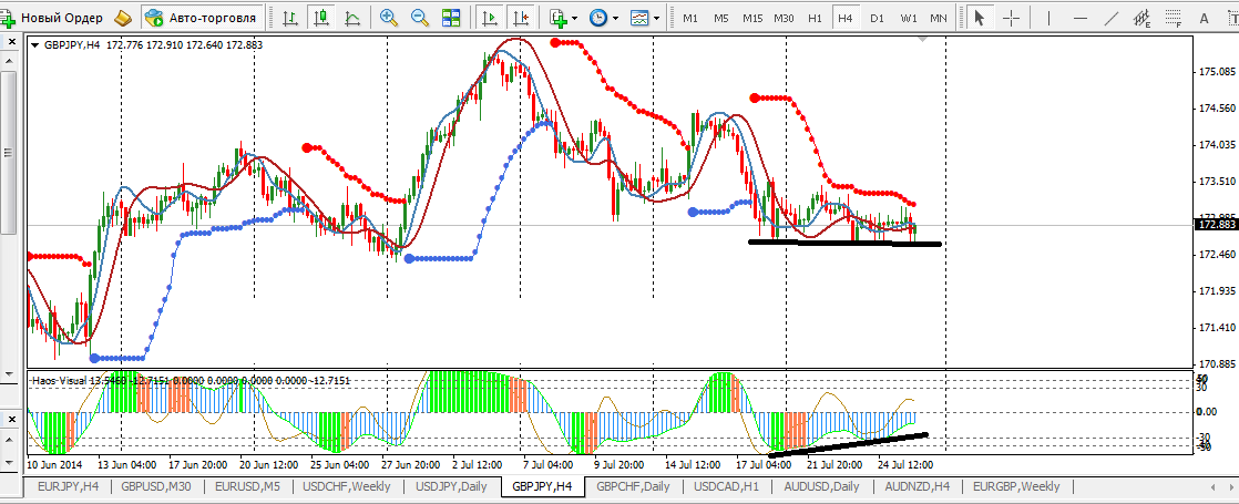 По паре GBP/JPY на 4-х часовом тайм-фрейме, цена находится в зажатом треугольнике что говорит об отсутствии какого-либо тренда, но в целом если рассматривать картину какой сейчас тренд вероятней всего я бы надеелся больше на вероятность покупок по причине того что есть сформированная дивергенция, но она только не потверждена пробоем, поэтому если цена выйдет из треугольника, тогда все шансы есть на формирование тренда уровень для формирование тренда я бы выделил пробой отметка 173.580 и затем пробитие 174.510.