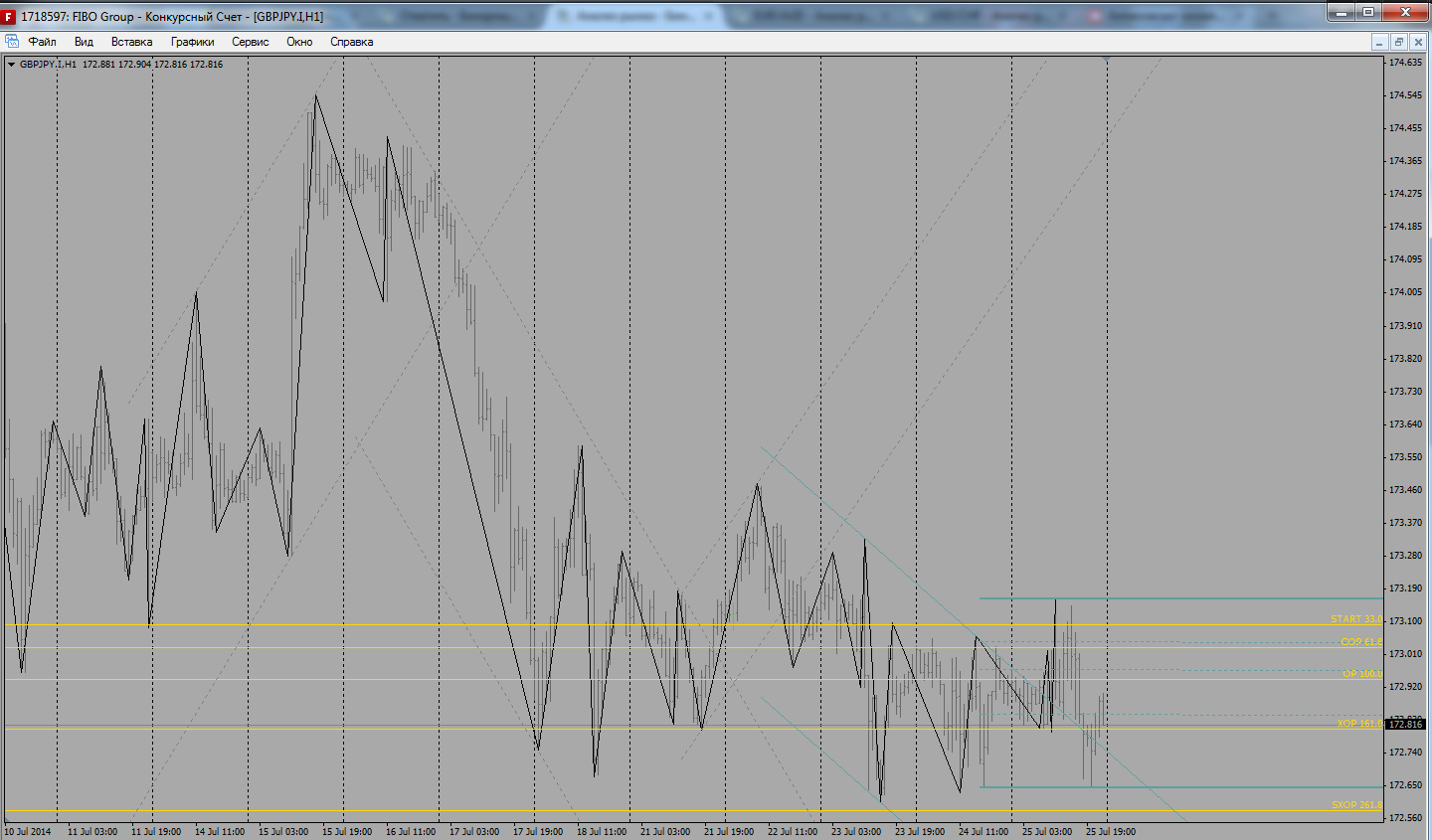 Валютная пара GBP/JPY к этому времени консолидируется на важной ценовой отметке. Текущая рыночная ситуация возникает либо при флете, либо при смене тренда. Расстояние до разворотного арбитражного уровня - 8пп. Точкой смены направления открытых позиций является уровень 172.90. Если открытых позиций нет, то сигналом к их открытию будет пробитие диапазона.