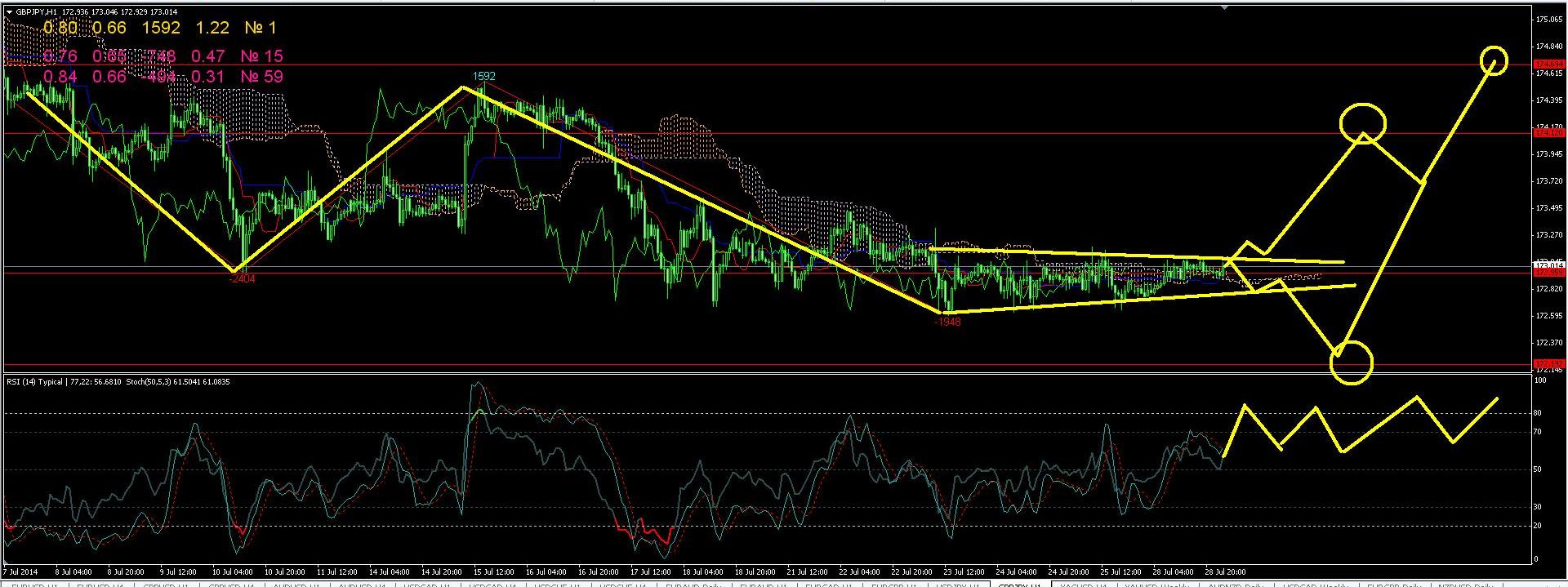 По паре GBPJPY на часовом графике пока пара зажата между двумя уровнями и сегодня вероятно будет прорыв в одну из сторон, пока все указывает что с текущих уже начнем укрепления к уровню 174,10 далее откат и рост к уровню 174,70, можно купить, если даже пойдем вниз то не сильно и на уровне 172,20 еще можно докупить, так как считаю потом будет рост.
