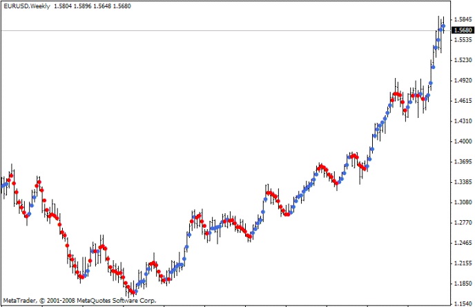 Индикатор работает по формуле рассчитывающей возможный тренд с учетом доминирования рыночных сил.