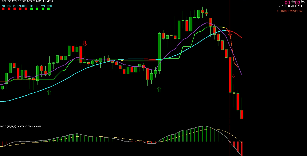 Если у нас появляется стрелочка, с указанием направления тренда, то мы смотрим на нижний индикатор, и если он так же показывает направление как, и стрелочка, и линии того же цвета, что и тренд, то смело открываем сделку.
