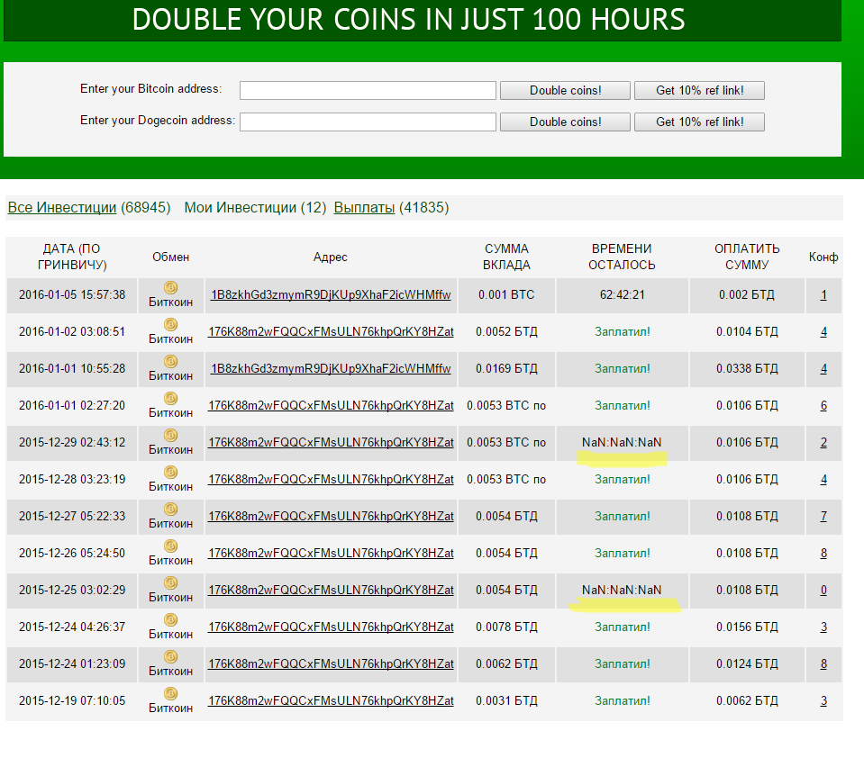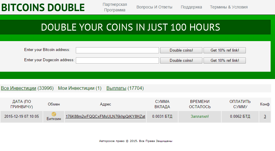 Все очень просто. Делаете инвестицию Bitcoin или Dogecoin на любую сумму и получите двойную прибыль через 100 часов.