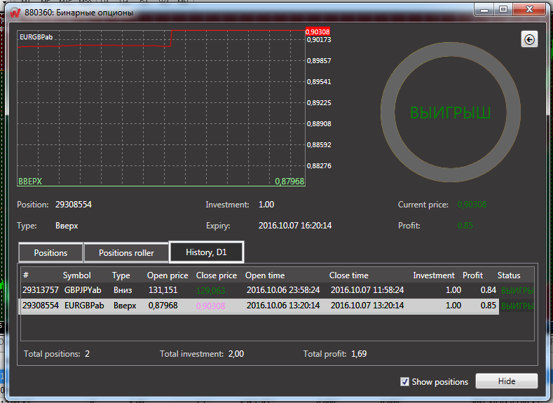 Анализ: валютная пара торгуется в устойчивом восходящем канале, обозначенном бардовым цветом. Сейчас цена немного скорректировалась вниз, но сильного отката не наблюдается. Соответственно, пара набирает силы для дальнейшего восхождения. На это также указывает общий восходящий тренд и особенно его динамика. Целью повышения ожидаю уровень 0.8865. Так что первый опцион выставляю на повышение. Судя по масштабу графика, это событие может наступить к вечеру завтрашнего дня. Поэтому время опциона - 1 день 2 часа.