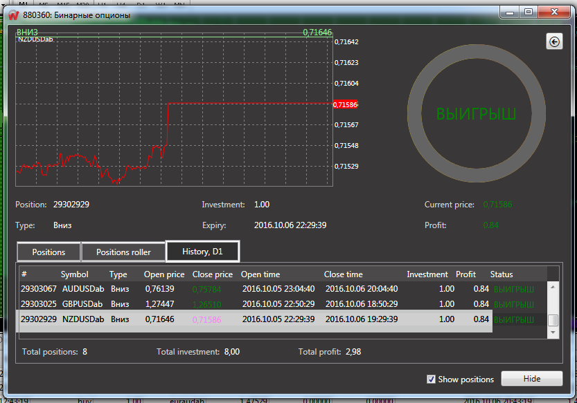 Выигрыш! Как и прогнозировалось, валютная пара торговалась в нисходящем канале. Цели были достигнуты. Но немного переборщил с продолжительностью опциона, так как не учёл отката. Желательно было уменьшить время опциона примерно на 3 часа. Учту это в следующий раз. А так канальная стратегия сработала превосходно.