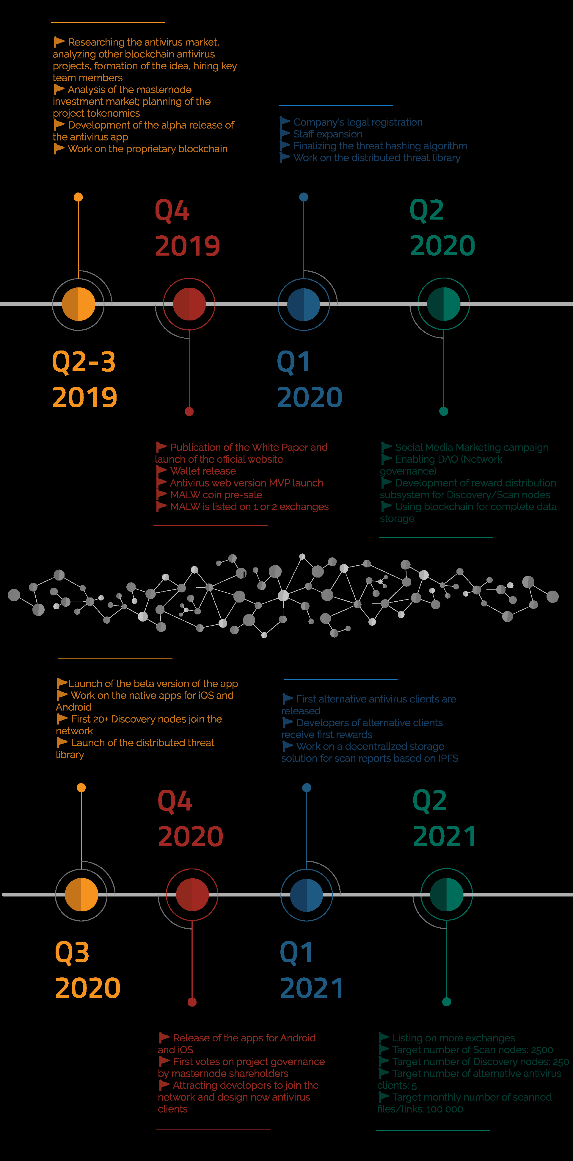 Сейчас команда проекта MalwareChain разрабатывает децентрализованную высокотехнологичную антивирусную платформу с использованием последних достижений блокчейн-индустрии. Используя эту платформу, любой пользователь может не только защитить свои устройства от большинства вирусов и вредоносных программ, но и получить вознаграждение, запустив свои собственные узлы, которые будут выполнять полезную работу для сети.
