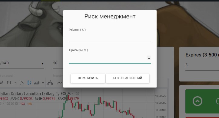 В начале каждого торгового дня вы сможете задать желаемый процент прибыли и убытка. При достижении одного из этих уровней торговля отключается. Данная функция поможет контролировать свои действия. Зачастую случается, что в порыве азарта трейдеры "заигрываются" и не могут остановиться. С данной функцией такая возможность исключается. Также если вам она не нужна, то можно нажать кнопку "Без ограничения".