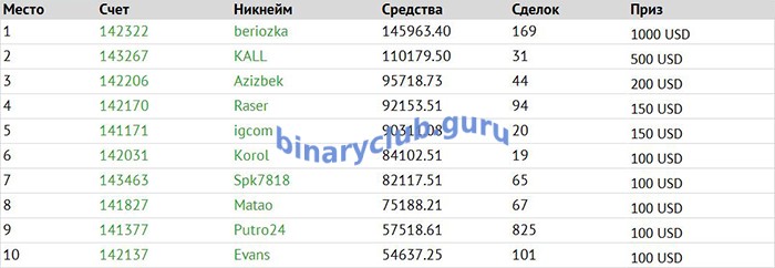 Лучшими трейдерами по итогам октябрьской «Битвы» стали конкурсанты с никнеймами: beriozka, KALL, Azizbek, Raser, igcom, Korol, Spk7818, Matao, Putro24, Evans.