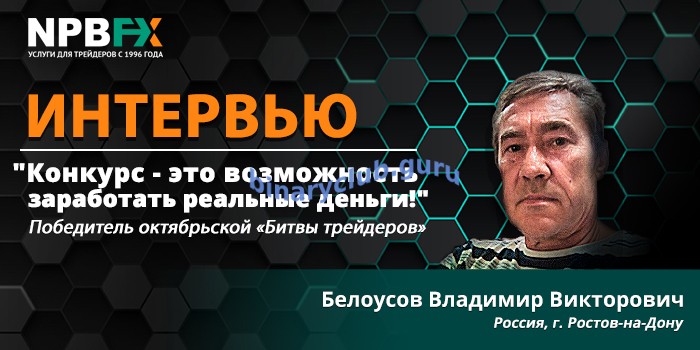 Уйти, чтобы вернуться и победить! Так ёмко можно описать профессиональный путь на Форекс опытного трейдера Белоусова Владимира Викторовича, который занял престижное первое место в конкурсе «Битва трейдеров» за октябрь. Победитель из российского города Ростов-на-Дону, ему 58 лет. Первое его знакомство с рынком состоялось еще в 2010 году, но в последние несколько лет Владимир Викторович поставил трейдинг «на паузу». Конкурс «Битва трейдеров» стал новой отправной точкой в движении вперед и принес победителю $1000 призовых на его реальный торговый счет в компании NPBFX. Особенно в конкурсе Владимир Викторович выделил дух соперничества, юзабилити мониторинга конкурса и удобную организацию. Трейдер торгует от уровней, говорит, что лишь торговой стратегии недостаточно для победы. Что еще нужно, чтобы занять первое место, и каким хочет видеть развитие рынка Форекс в России победитель читайте в интервью!