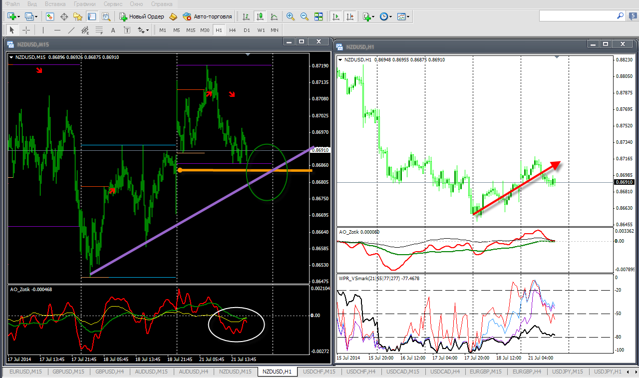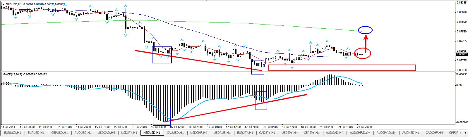 По паре NZD/USD на часовом тайм-фрейме сформировалась дивергенция, но пока цена находиться под давлением тренда на продажу в лучшем случае стоит ожидать покупки до цели 0.87375, но пока для цели является ближайшее сопротивление отметка 0.87000, но при пробитии уровня поддержки отметки 0.86481, тогда будут цели отменены на покупку так как тренд уже будет целеком нисходящий.