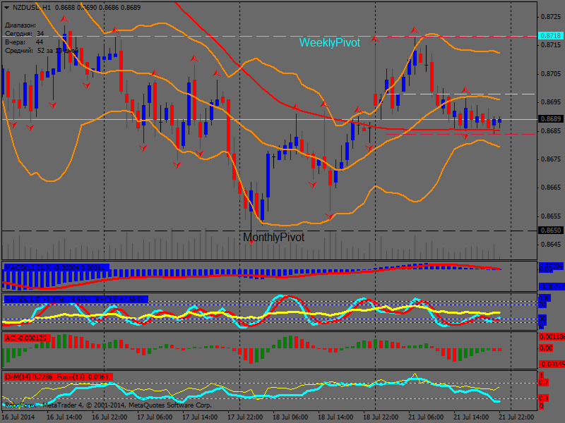 Валютная пара новозеландец доллар сегодня торгуется в нисходящем движении и смогла снизится на 34 пункта. Индикаторы макди, болинжер и ац показывают на снижение. Считаю что цена продолжит снижаться до месячного уровня поддержки 0,8650.